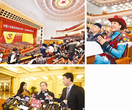 左上图:记者在人民大会堂内直播政协会议开幕。 记者 刘龙摄