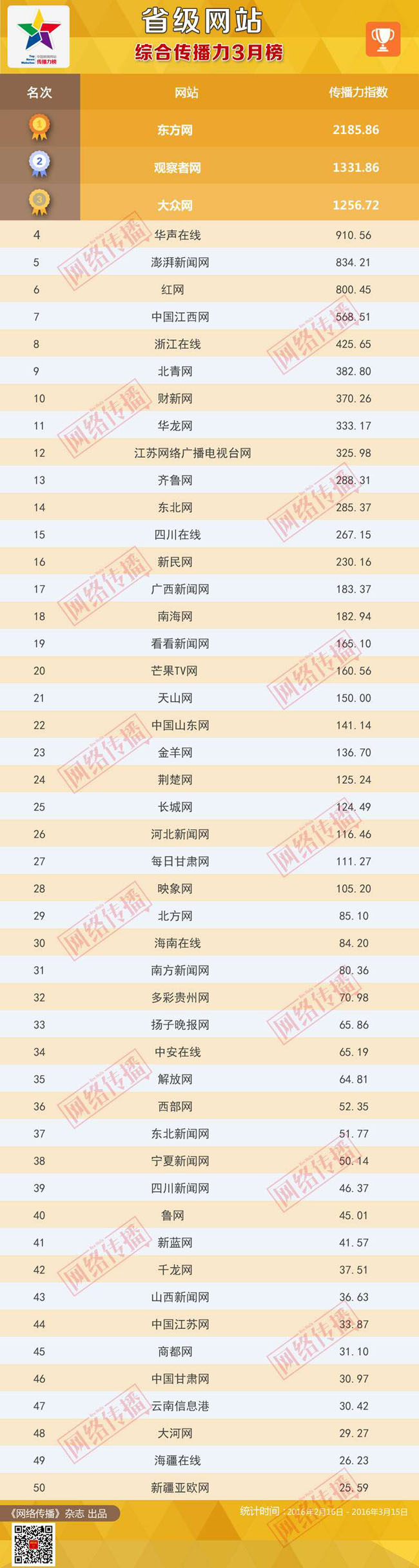 中央网信办《网络传播》杂志倾力打造的“省级网站传播力2016年3月榜”今日正式发布。