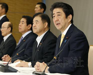 8月28日上午,安倍晋三在官邸出席新国立竞技场相关阁僚会议并致辞。邻座为奥运担当相远藤利明。(共同社)