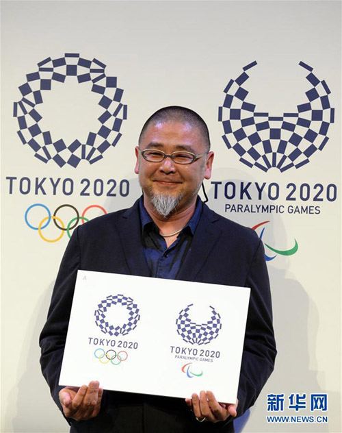 2020年东京奥运会及残奥会会徽设计者野老朝雄与会徽合影。 新华社记者 马平 摄