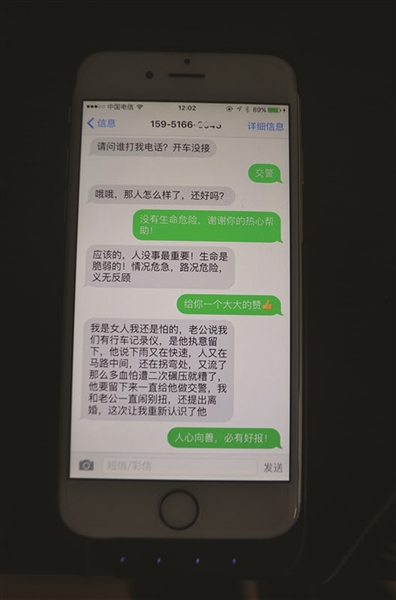 随后,记者从警方处了解到,经民警对该起事故调查得知,当时雨天路滑,骑摩托车的男子因车速较快而摔倒在地,还好伤得不重,又正好遇到了好心人救助,目前已无大碍。而这位好心的中年男子,也因他善良的行为,挽救了自己的婚姻。好人有好报,他妻子的短信正好印证了这一点:“我是女人我还是怕的,老公说我们有行车记录仪,是他执意留下的,他说下雨又在快速(通道上),人又在马路中间,还在拐弯处,又流了那么多血,怕遭二次碾压就糟了,他要留下来一直给他做交警,我和老公一直闹别扭,还提出了离婚,这次让我重新认识了他。”