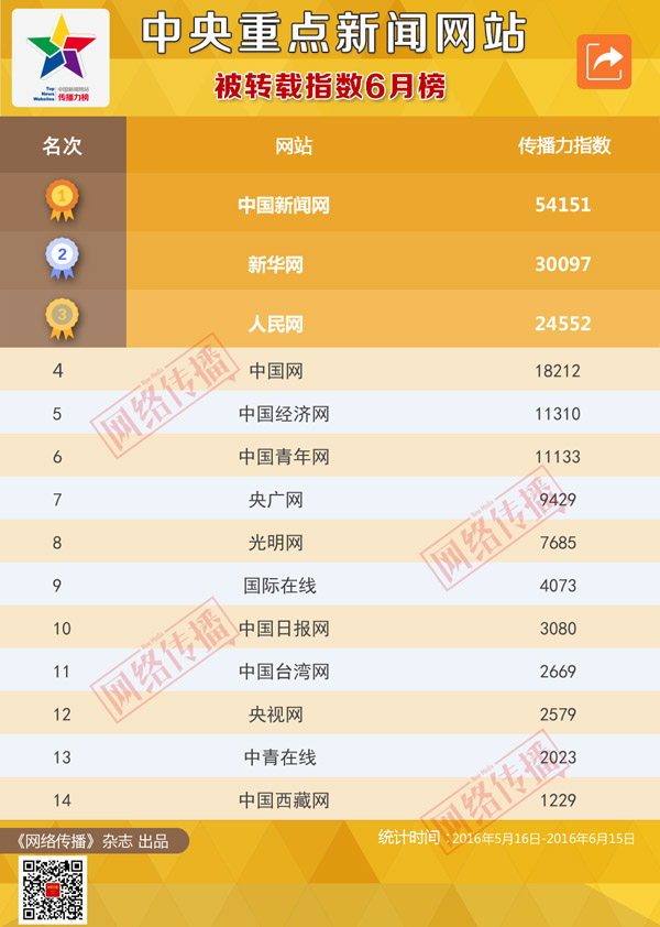 由中央网信办《网络传播》杂志精心打造的“新闻网站被转载指数”今日正式推出,旨在客观反映新闻网站原创报道内容在各类新闻网站中的传播效果。此次发布为2016年6月榜,统计时间为2016年5月15日至6月15日。