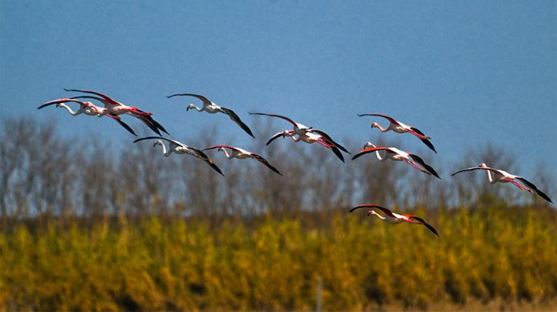 江苏东台:火烈鸟飞抵条子泥湿地越冬