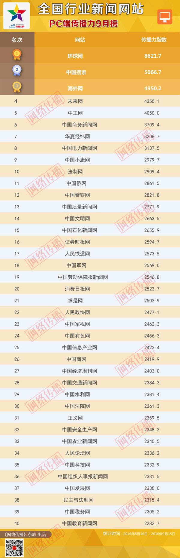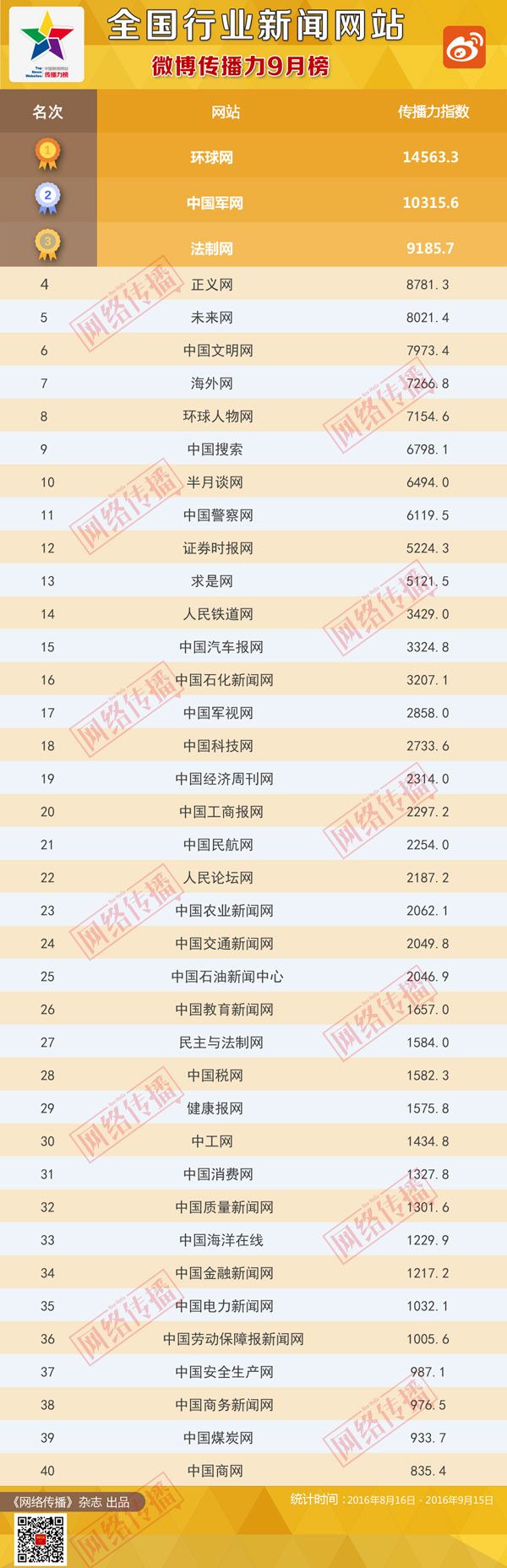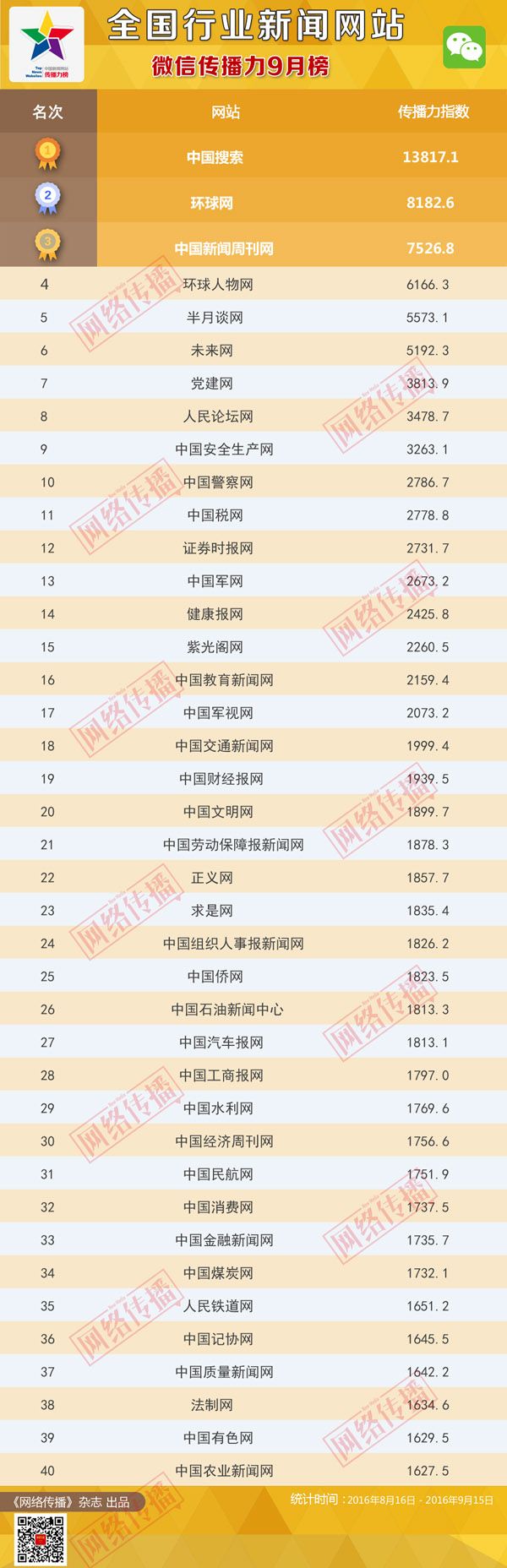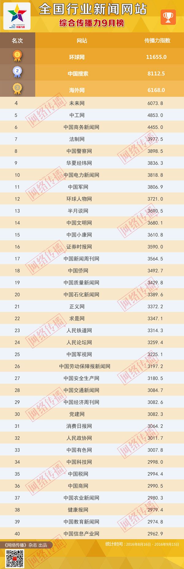 中央网信办《网络传播》杂志倾力打造的“全国行业新闻网站传播力2016年9月榜”今日正式发布。