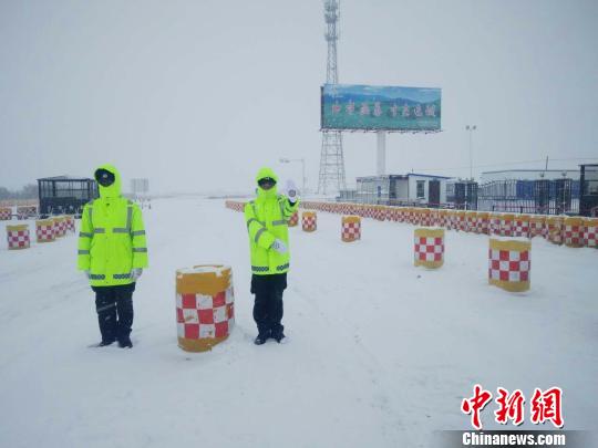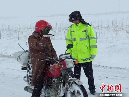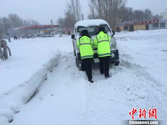 当地公安干警在恶劣天气下,坚守一线,提醒过往市民减速慢行。 哈巴河县公安局提供。 摄