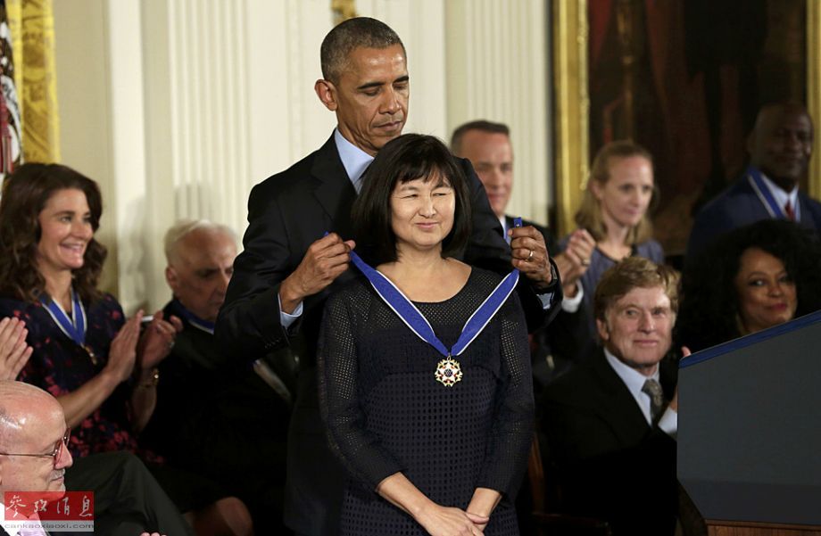 据美国《华盛顿邮报》报道,奥巴马总统上周公布了“总统自由奖章”的21位获奖人,其中包括比尔·盖茨、NBA球星贾巴尔(Kareem Abdul-Jabbar)、奥斯卡影帝汉克斯(Tom Hanks)、著名篮球运动员乔丹(Michael Jordan)、流行乐巨星史普林斯汀(Bruce Springsteen)等各领域杰出代表。其中有一位华裔建筑师林樱(Maya Lin),她是林徽因的侄女,因设计华盛顿越战纪念碑而成名。图为奥巴马为林樱佩戴奖章。