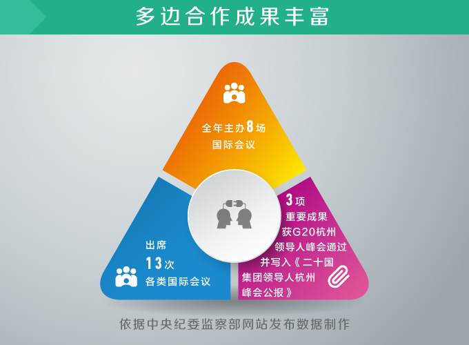反腐败国际合作的中国声音越来越宏亮、中国故事越来越精彩。从2014年北京APEC峰会通过《北京反腐败宣言》,到2016年G20杭州峰会通过《二十国集团反腐败追逃追赃高级原则》《二十国集团2017-2018年反腐败行动计划》,在华设立G20反腐败追逃追赃研究中心;从2016年组织32个代表团出访43个国家和地区、接待35个外国代表团组和4个国际组织来访,到签署和续签6个双边反腐败合作谅解备忘录、13次为54国1个国际组织来访团组专题介绍中国反腐败工作,中国的主张越来越被国际社会倾听,拒绝腐败分子入境、追缴和归还腐败资产越来越成为国际反腐败合作的重要议题。