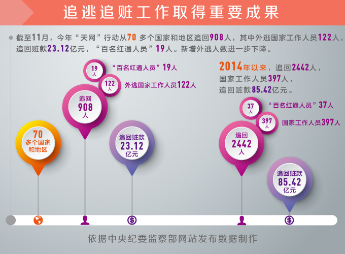 央视网消息:据中央纪委监察部网站消息,“截至11月,今年‘天网’行动共从70多个国家和地区追回908人,其中外逃国家工作人员122人,追回赃款23.12亿元,‘百名红通人员’19人。”12月9日,第13个“国际反腐败日”到来之际,国家预防腐败局副局长、中央纪委国际合作局局长刘建超接受采访时表示,“中国正在以自身追逃追赃的实践引领国际反腐败执法合作。”