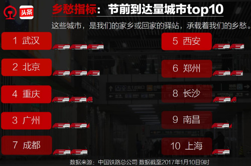 根据中国铁路总公司截至2017年1月10日9时的数据,报告还给出节前到达量城市top10,称之为“乡愁指标”。