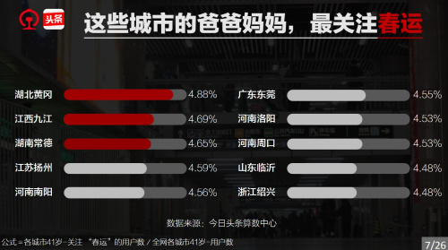 结果显示,湖北黄冈的爸爸妈妈最关注春运,其次是江西九江、湖南常德。