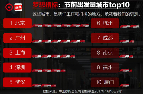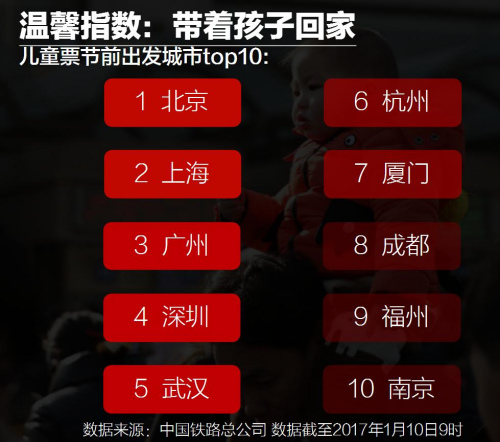 根据中国铁路总公司截至2017年1月10日9时的数据,该报告排出了节前出发量城市前十名,分别是北京、广州、上海、深圳、武汉、杭州、成都、南京、福州、厦门。
