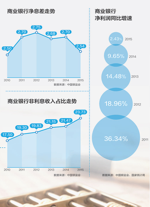 18.96%、14.48%、9.65%、2.43%,从2012年到2015年,商业银行净利润增幅走出了一条明显的下行曲线。