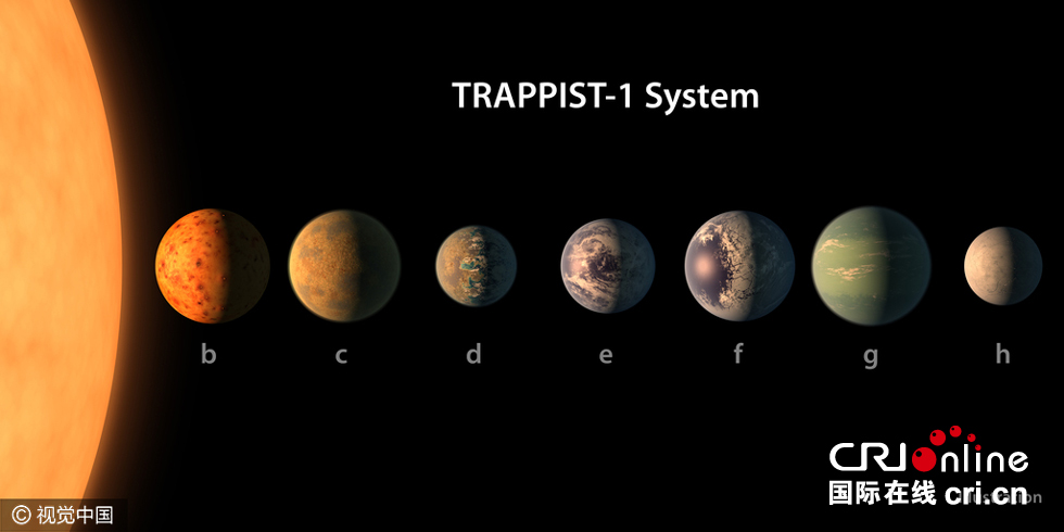 据美国宇航局网站(NASA)消息,天文学家宣布,在距离地球40光年的单颗恒星周围发现7颗地球大小的类地行星,其中3颗确定位于宜居带内,或许它们都有水存在。该发现一举打破了在太阳系外单颗恒星周围发现“宜居带内”行星数量的纪录。图片来源:视觉中国