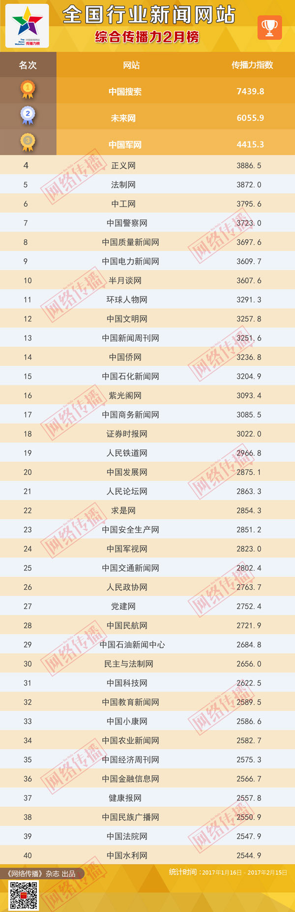 中央网信办《网络传播》杂志倾力打造的“全国行业新闻网站传播力2017年2月榜”今日发布。