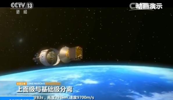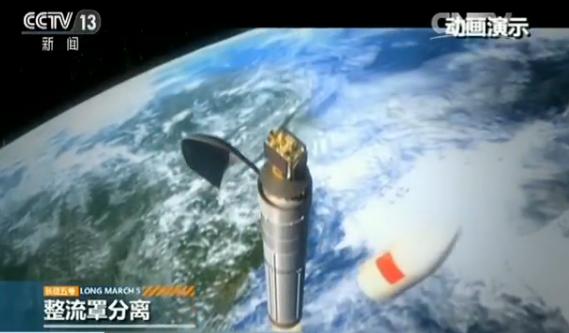 飞行到约174秒,火箭四个助推器完成任务,与火箭主体脱离。285秒,此时长征五号已经飞出大气层,保护有效载荷的顶部整流罩结束了自己的使命,与火箭分离。465秒,一级火箭燃料耗尽,一二级火箭分离,火箭二级发动机启动。约753秒,二级发动机关闭,火箭进入滑行阶段。约1355秒,二级发动机进行二次点火。约1714秒,火箭二级发动机在达到预定目标后停止工作,96秒以后,星箭分离,火箭将有效载荷送到预定轨道,长征五号火箭就此完成了它的全部使命。