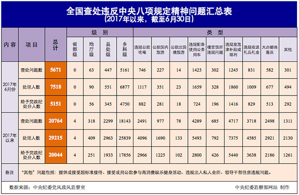 据中央纪委监察部网站消息,2017年以来,截至6月30日,全国查处违反中央八项规定精神问题情况如下: