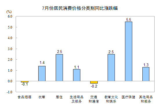 7月份,其他七大类价格同比六涨一降。其中,医疗保健价格上涨5.5%,居住、教育文化和娱乐价格均上涨2.5%,衣着、其他用品和服务、生活用品及服务价格分别上涨1.4%、1.3%和1.1%;交通和通信价格下降0.2%。