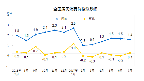 2017年7月份,全国居民消费价格同比上涨1.4%。其中,城市上涨1.5%,农村上涨1.0%;食品价格下降1.1%,非食品价格上涨2.0%;消费品价格上涨0.5%,服务价格上涨2.9%。1-7月平均,全国居民消费价格总水平比去年同期上涨1.4%。