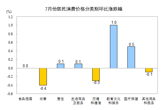 7月份,全国居民消费价格环比上涨0.1%。其中,城市上涨0.1%,农村持平;食品价格下降0.1%,非食品价格上涨0.2%;消费品价格下降0.2%,服务价格上涨0.6%。