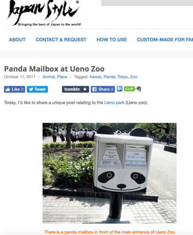 上野动物园门口附近也设有熊猫图案的邮筒,在这里投寄将会被盖上含有熊猫等图案的邮戳。还有很多携家带口的顾客会特意去“上野三井花园饭店”的“熊猫屋”,在抱枕以及马克杯等各种熊猫物品的围绕下度过休闲时光。