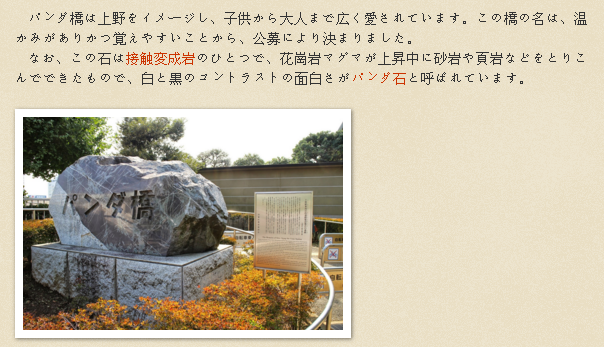 跨过JR上野站的过街天桥前往上野公园一侧,可以看到刻有天桥名字“熊猫桥”的大石头。黑白分明的这块石头被人们俗称为“熊猫石”。