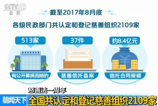 截至2017年8月底,各级民政部门共认定和登记慈善组织2109家,其中有公开募捐资格的513家,慈善信托备案37件,信托合同规模约8.4亿元。其中民政部共认定和登记慈善组织110家,其中给予公开募捐资格的61家。