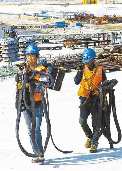 工人们在大桥口岸标段桥面上施工