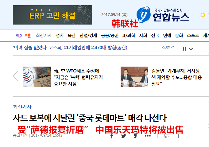 【环球网报道 记者 刘昆 赵衍龙】据韩联社9月14日报道,受在韩部署“萨德”反导系统影响,乐天玛特在中国业绩惨淡、不堪重负,最终决定进行出售在华超市。乐天集团此前想维持在华经营,但因“前路渺茫”选择对乐天玛特进行变卖处分。