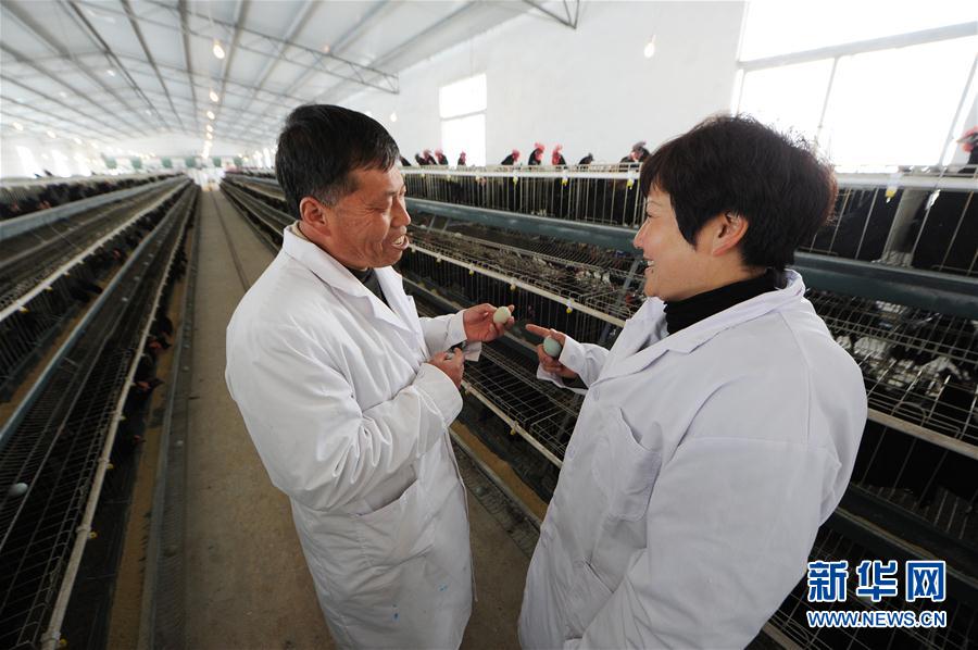 余留芬(右)在岩博村种鸡养殖场向工作人员了解养殖场生产情况(2014年1月14日摄)。新华社记者 陶亮 摄