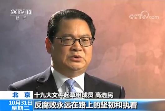 十九大文件起草组成员 高选民:报告指出就是一定要以反腐败永远在路上的坚韧和执着,坚持无禁区、全覆盖、零容忍。建立制度,从根本上来铲除滋生腐败的土壤,从制度上来防范和惩治腐败,把制度的笼子越扎越紧,我们反腐败斗争才能取得最终的胜利。