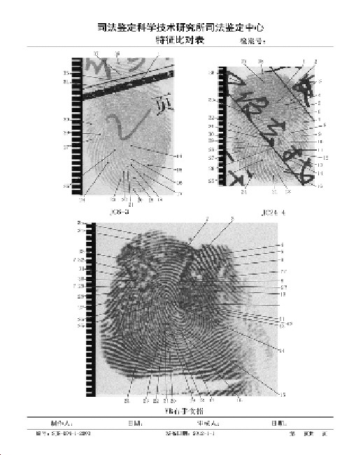 “由于捺印条件的变化,很多指纹特征都不明显。”施少培说,“我们首先在这近两百枚指纹中找到两个相对完整的。”通过显微镜观察这两枚指纹,一共找到了58处特征,这才建立了统一的标识系统。