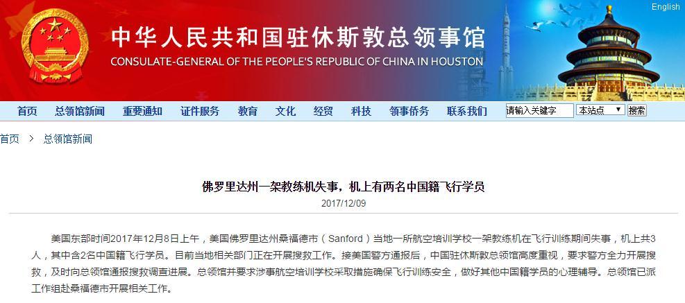 央视网消息:当地时间12月8号,美国佛罗里达州的一架小型商用教练机失事后坠入湖中,机上三人全部失踪,据称除教练之外的两名学员均为中国籍男性。目前美国联邦航空管理局和美国国家运输安全委员会都已经介入调查,尚未得出调查结果。