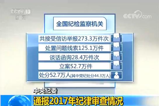 2017年,全国纪检监察机关共接受信访举报273.3万件次,处置问题线索125.1万件,谈话函询28.4万件次,立案52.7万件,处分52.7万人(其中党纪处分44.3万人)。其中,处分省部级及以上干部58人,厅局级干部3300余人,县处级干部2.1万人,乡科级干部7.8万人,一般干部9.7万人,农村、企业等其他人员32.7万人。