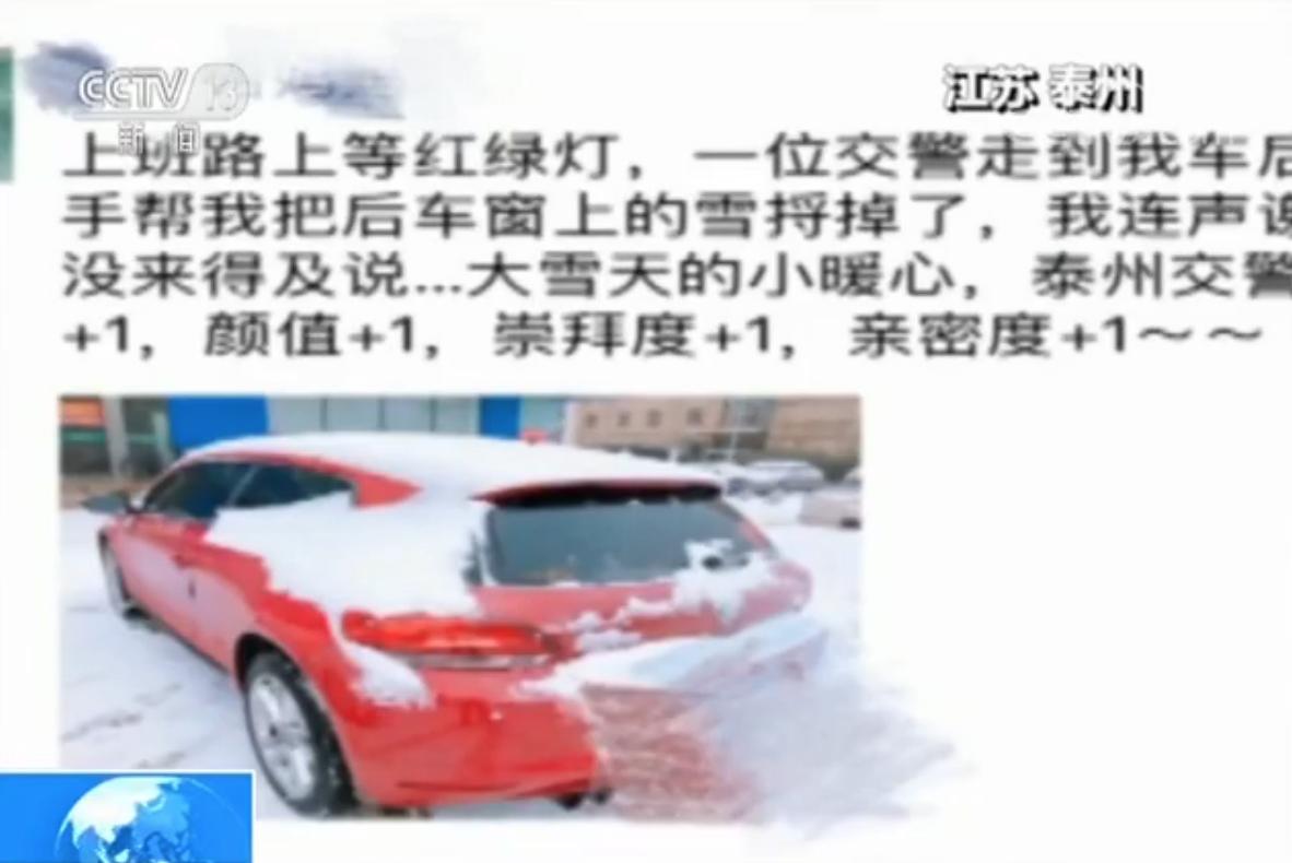 当天上午,一位泰州市民在微信朋友圈发了一段文字:“上班路上等红绿灯,一位交警走到我车后,徒手帮我把后窗上的雪捋掉了,我连声谢谢都没来得及说……”随后,又有市民在微信朋友圈发了一段情节类似的视频。视频中直行车道正是红灯,一名交警正在路面执勤,他徒手替面前的这辆车擦去了后窗的积雪。