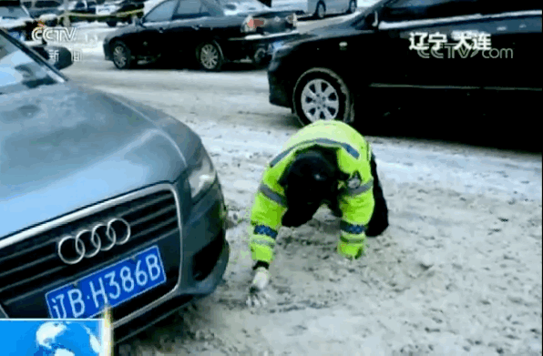 同样在网上热传的,还有一段“交警跪地扫雪”的视频。22号,辽宁省大连市降下大雪。在鞍山路有一段斜坡又长又陡,执勤交警吴玉琳为了帮助车辆脱困,跪地徒手扫雪。