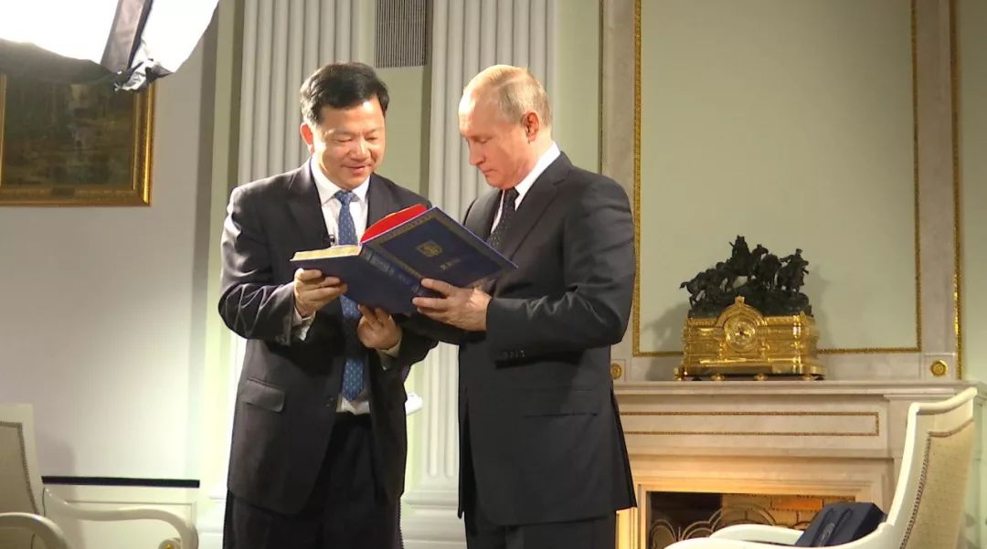 △在采访前,慎海雄向普京总统展示了中央广播电视总台旗下新媒体平台推出的网络互动活动“谁是普京粉”和“我想问普京”的画册。画册封面印有习近平主席与普京总统的合影。