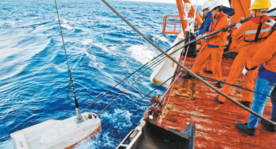科考队员在回收单拖体瞬变电磁仪。 中国大洋协会供图