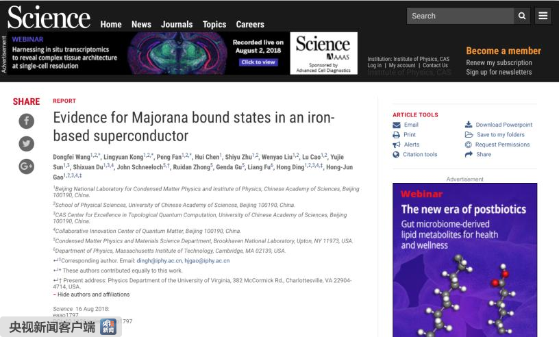 此次发现的高纯度马约拉纳任意子,对构建稳定的、高容错、可拓展的未来量子计算机的应用具有极其重要意义。该项研究成果今天(8月16日)在国际著名学术杂志《科学》上在线发表。(央视记者 张昕)