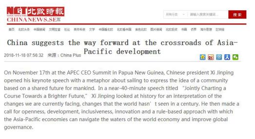 “我们同在一条船上”。11月17日,中国国家主席习近平用这句表达命运共同体理念的比喻,开启了他在巴布亚新几内亚APEC工商领导人峰会上的主旨演讲。在这篇近40分钟的演讲中,习近平以“同舟共济创造美好未来”为主题,以史为鉴,剖析了百年未有的世界变局,提出以开放、发展、包容、创新、规则为导向的“五点主张”,为亚太各经济体如何把握世界经济发展方向、找到有效的全球治理思路,提供了“中国方案”。