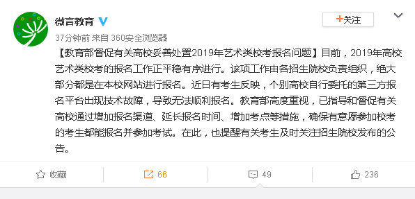 央视网消息:目前,2019年高校艺术类校考的报名工作正平稳有序进行。该项工作由各招生院校负责组织,绝大部分都是在本校网站进行报名。近日有考生反映,个别高校自行委托的第三方报名平台出现技术故障,导致无法顺利报名。教育部高度重视,已指导和督促有关高校通过增加报名渠道、延长报名时间、增加考点等措施,确保有意愿参加校考的考生都能报名并参加考试。在此,也提醒有关考生及时关注招生院校发布的公告。(央视记者 柴丹枫)