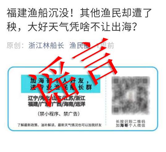 央视网消息:不久前,在福建省漳州市东山县,一个消息在渔民之间流传:因为发生渔船沉没事故,100天内禁止渔民出海生产,渔民纷纷表示不满。这一消息引发了渔民的恐慌,警方调查后发现,这是一个谣言。发布这一消息的公众号作者赵某是河北沧州人,他在一个东山县本地渔业公司的微信群里看到相关信息后,为了炒作吸引粉丝,便将政府文件中的“开展为期一百天的渔业安全生产大排查大整治”篡改解读为“禁海100天”。并且,不经核实将网友的聊天记录发布。经警方劝导,近日,赵某主动从河北来到福建,到案自首,已被处以行政拘留5日。