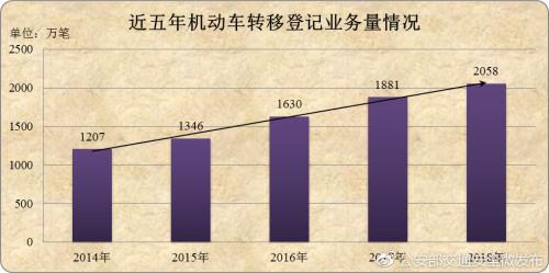 汽车转移登记业务量持续增长,二手车交易市场日益活跃。2018年,全国共办理机动车转移登记2128万笔,其中汽车转移登记2058万笔,占96.72%,比2017年增加177万笔,增长9.44%。从统计情况看,近五年汽车转移登记与注册登记业务量的比例由0.55上升至0.77,反映出二手车交易市场日益活跃。