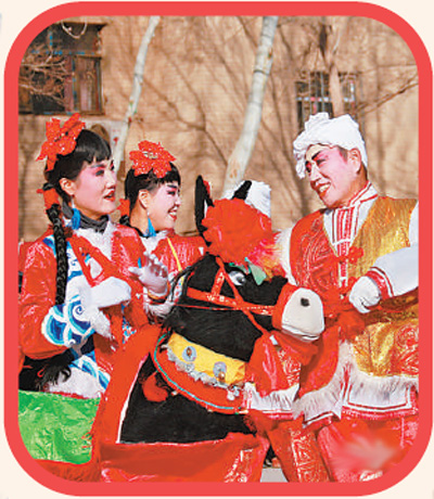 甘肃敦煌市2019迎新春社火大赛活动现场,参赛队员表演社火跑驴。张晓亮摄(人民视觉)