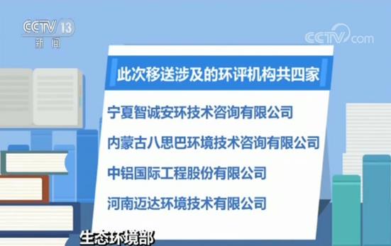 此次移送涉及的环评机构共四家,它们分别是:宁夏智诚安环技术咨询有限公司、内蒙古八思巴环境技术咨询有限公司、中铝国际工程股份有限公司、河南迈达环境技术有限公司。