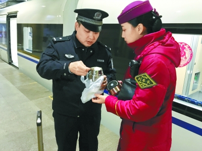 他是北京铁路公安处的一名乘警,她是京广高铁车队的一名列车长,昨天傍晚在北京西站的站台上,乘客们目睹了这一对“双乘夫妻”站台相送的感人一幕。