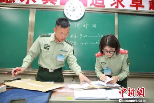 资料图:2018年全军面向社会公开招录文职人员考试。图为开考前监考人员检查试卷。 钟欣 摄
