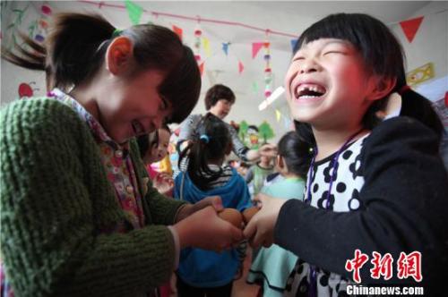 资料图:孩子们进行“斗蛋比赛。窦跃文 摄