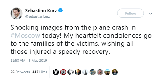 库尔茨在推特中写道:“今天莫斯科飞机坠毁的图片令人震惊!我向遇难者家属表示诚挚的慰问,祝愿所有伤者早日康复。”