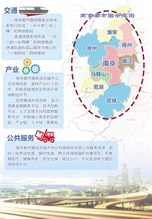 此外,南京都市圈还将重点推动主枢纽、主景区、主城区之间的快联快通,加密过江通道建设,加快形成宁镇扬、宁滁30分钟快速通勤圈、1小时休闲旅游生活圈、1小时生产要素物流圈。