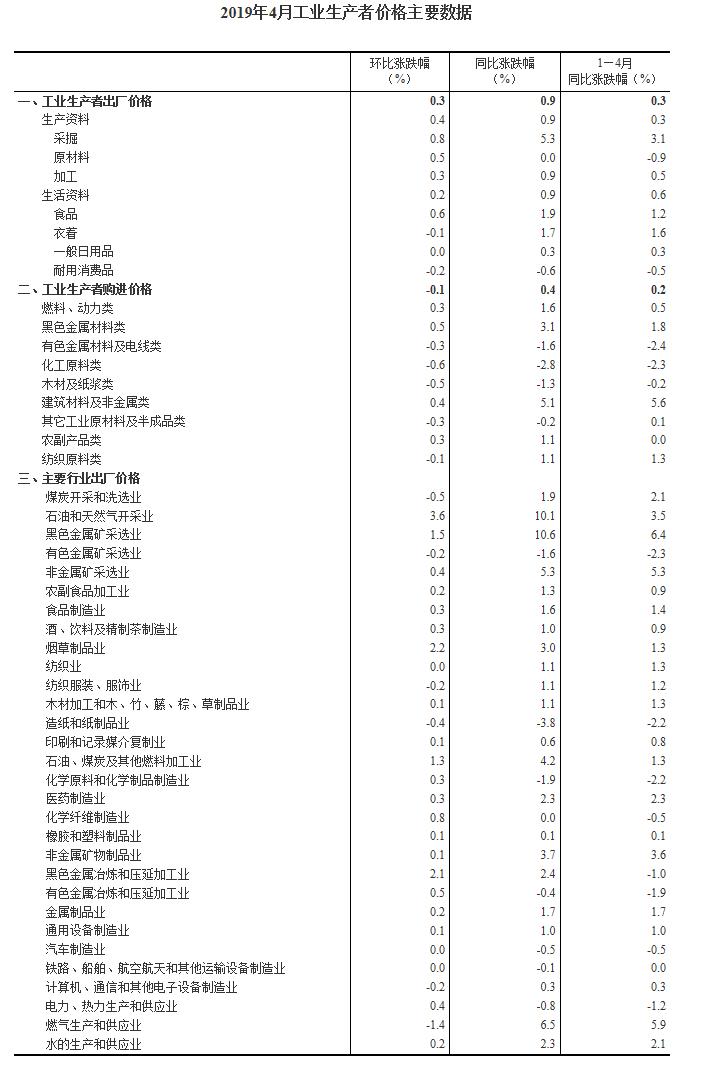 2019年4月工业生产者价格主要数据